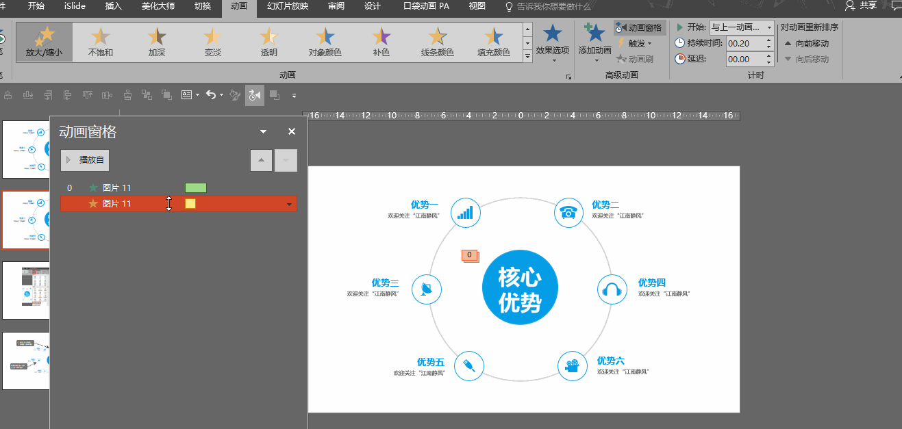 给“核心优势”添加“基本缩放”动画,触发动画为“与上一动画同时”,时间设置为0.4S