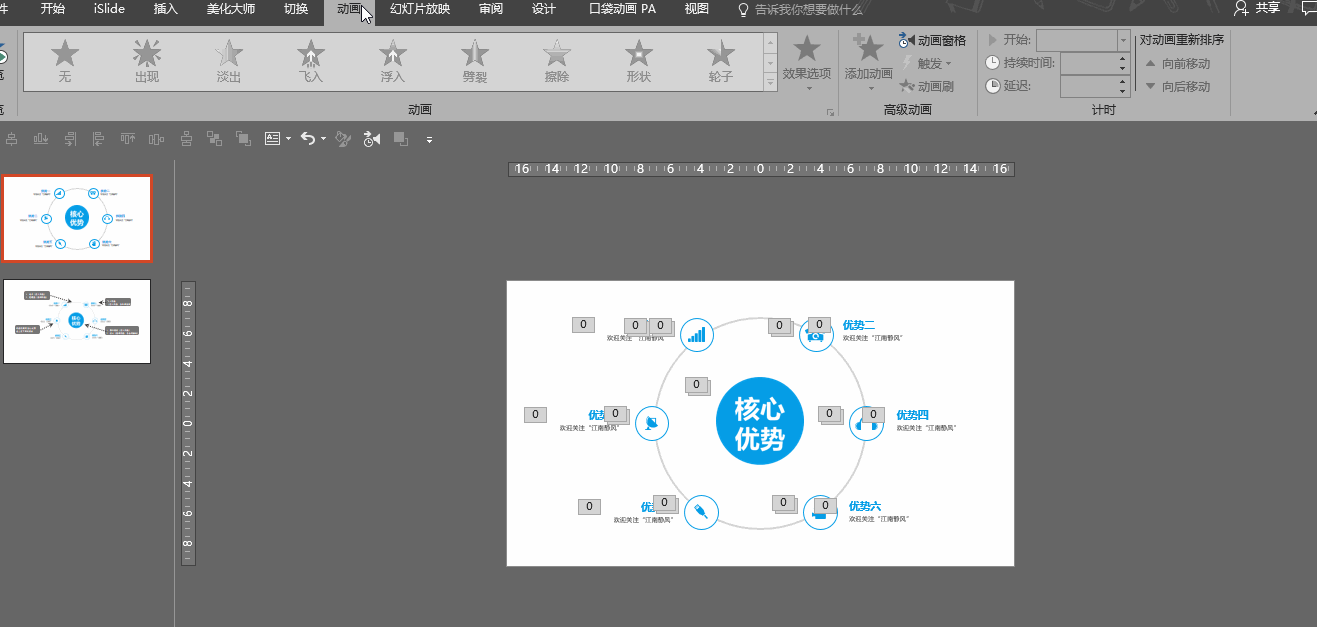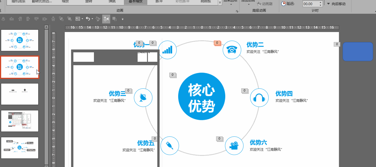可以使用动画刷把“核心优势”的动画复制给六个图标,然后用鼠标拖动他们的时间轴的位置,并保证他们与上一个之间有0.2S的时间差。