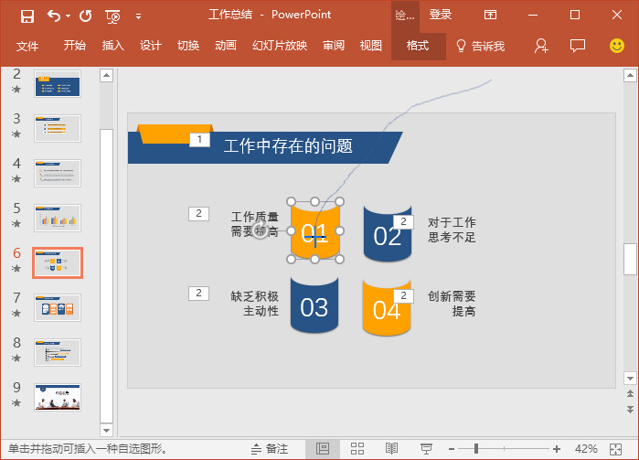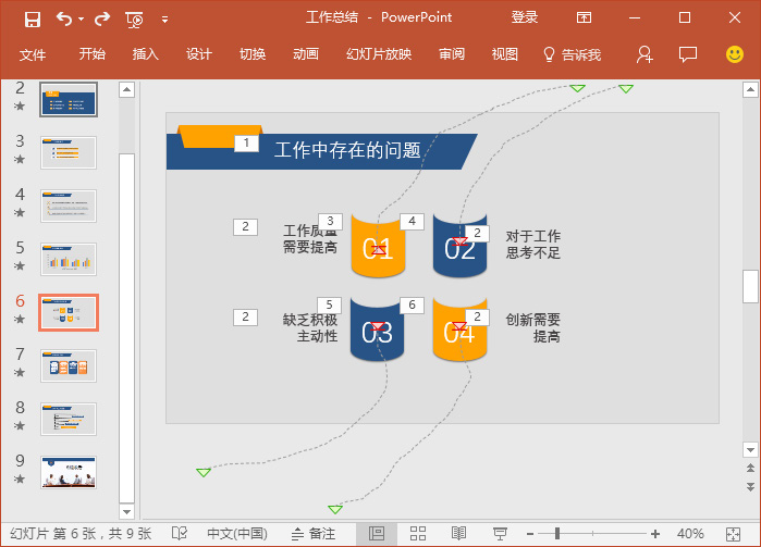 眼看着公司大会, OK,今天的文章就通过一个示例来为大家介绍一个不那么单纯的动画效果——自定义路径动画。 实战01:在“工作总结”演示文稿中为对象绘制动作路径 接下来将在下图所示的“工作总结”演示文稿中的部分对象为大家演示绘制动作路径的方法,具体操作步骤如下。 Step2 此时鼠标指针变成+形状,在需要绘制动作路径的开始处拖动鼠标绘制动作路径。 Step3 绘制到合适位置后双击,即可完成路径的绘制。 Step5 使用前面绘制动作路径的方法,为幻灯片中的其他形状绘制动作路径。 实战02:在“工作总结”演示文稿中调整动画路径长短 例如,继续上例操作,在“工作总结”演示文稿中对绘制的路径长短进行调整,具体操作步骤如下。 在打开的“工作总结”演示文稿中选择下图所示幻灯片中绘制的动作路径,此时动作路径四周将显示控制点,将鼠标指针移动到任意控制点上,这里将鼠标指针移动到右上角的控制点上,鼠标指针将变成如图所示的形状。 Step2 按住鼠标左键不放,向右上角拖动鼠标,拖动到合适位置后释放鼠标,即可查看到调整动作路径后的效果。 Step3 选择第 6 张幻灯片上方的两条动作路径,将鼠标指针移动到右上角的控制点上,按住鼠标左键不放进行拖动。 Step4 拖动到合适位置后释放鼠标,即可调整动作路径的长短。 实战03:对“工作总结”演示文稿中动作路径的顶点进行编辑 例如,继续上例操作,为“工作总结”演示文稿中动作路径的顶点进行编辑,具体操作步骤如下。 在打开的“工作总结”演示文稿中选择下图所示幻灯片下方左侧的动作路径;在其上右击,在弹出的快捷菜单中选择【编辑顶点】命令。 Step2 此时在动作路径中将显示路径的所有顶点,选中需要删除的顶点并右击,在弹出的快捷菜单中选择【删除顶点】命令。 Step3 Step4 选择右边的动作路径,退出【03】动作路径的编辑状态,编辑【04】动作路径,选择动作路径中需要移动的顶点,然后拖动鼠标移动顶点位置,即可改变动作路径。 拖动到合适位置后释放鼠标,然后在需要删除的顶点上右击,在弹出的快捷菜单中选择【删除顶点】命令。 Step6 即可删除顶点,然后使用相同的方法继续删除不需要的顶点,在动作路径需要添加顶点的位置右击,在弹出的快捷菜单中选择【添加顶点】命令。 Step7