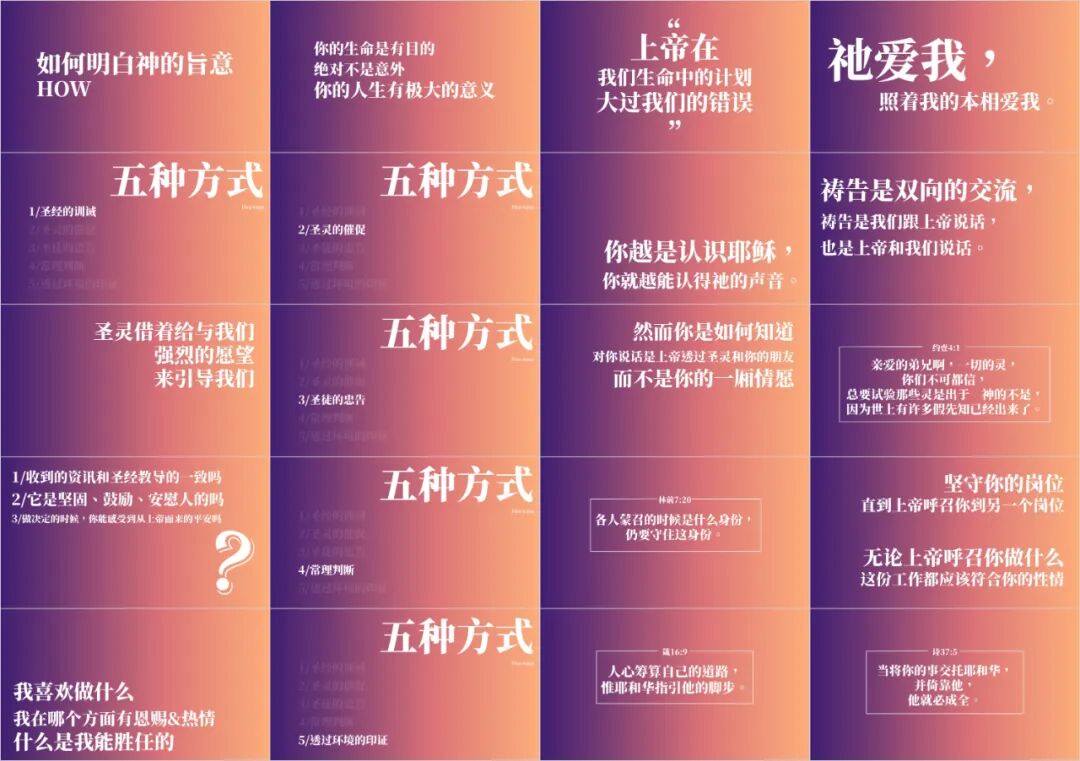 那天的课程是《如何明白神的旨意》,渐变色背景+大字设计,效果也很不错!