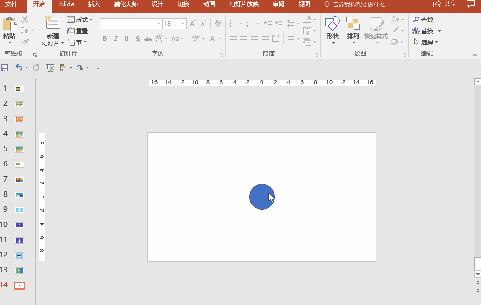 ❶ 同时选中两个圆形,在菜单栏依次点击【iSlide】-【补间动画】。