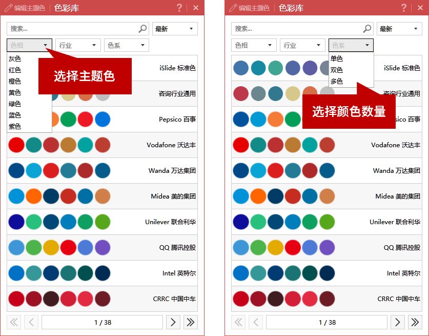 从打开中的界面,可以根据你想要的主题色以及颜色数量。如果你平时制作 PPT 时,实在不知道该如何配色,还有一个【行业】配色参考供你选择。