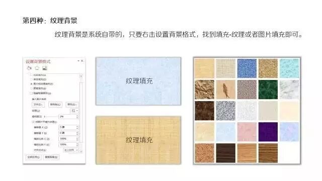 纹理背景是office系统自带的,里面有木质纹理、画布纹理、大理石纹理、信封纹理等,这些纹理图片都是经过设计师特殊设计的。如果使用得当,效果非常好。