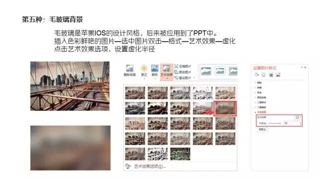 虚化背景又称为毛玻璃背景,源于苹果的IOS设计风格,后来被应用到了PPT设计中,它通常是将一张色彩较为明亮鲜艳的图片进行虚化处理。