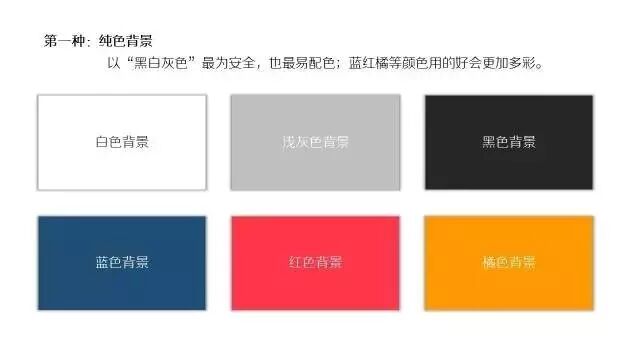 纯色背景分为两类,一种为黑白灰等“无色”背景,另一种就是彩色背景。黑白灰等无色背景,是安全的背景,容易配色,所以在使用上最多,如果没有色彩基础的朋友,建议还是用无色背景;彩色背景最好是经过”稀释“过的,不能太亮,否则就会影响观众对于文本的阅读。