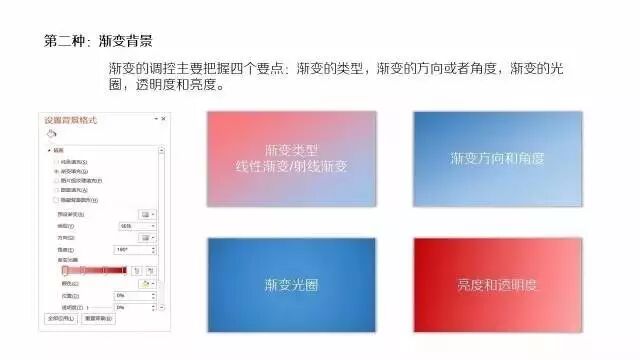 设计的方法你可以选中PPT的空白处,右键单击,设置背景格式,然后进行以上五项的调整。特别注意的是,在设置渐变色时,不要使用太多色系的颜色。