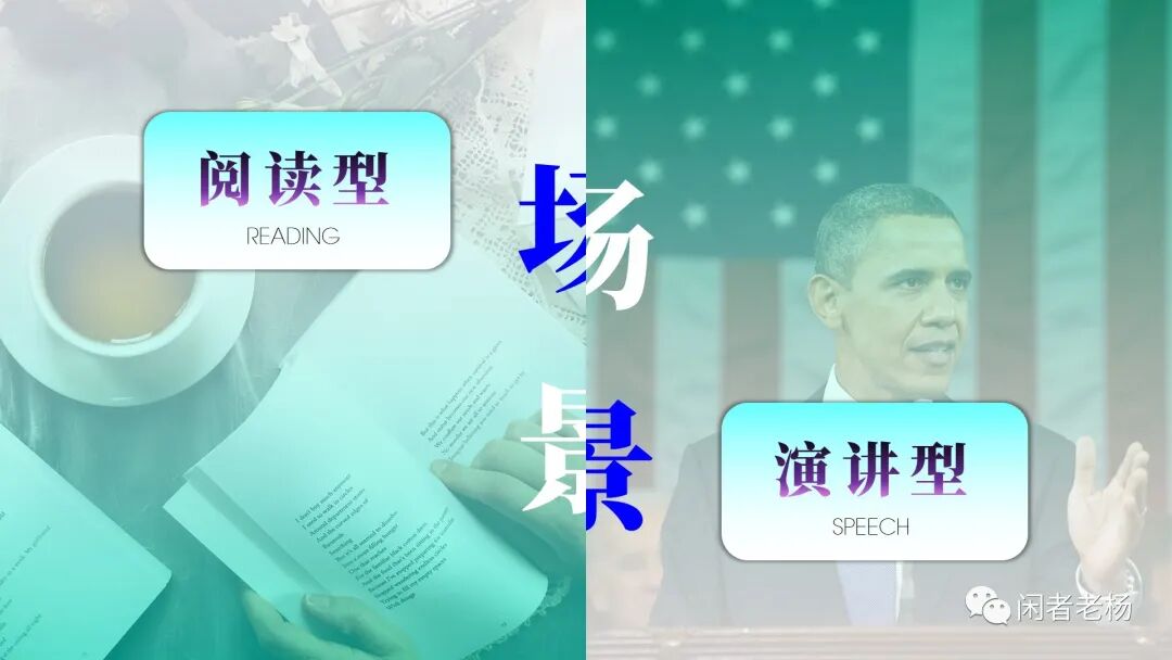 这里我引用了三爷老师的总结,所有的 PPT 一般来说就两种应用场景:阅读或演讲。也就是说,一个 PPT,要么是给人自己看的,要么是需要别人边讲边看的。阅读型 PPT 和演讲型 PPT 最大的区别在于:阅读型 PPT 主要是一些记录或总结,其本身就是全部,一般不需要讲也可以读懂;演讲型 PPT 是辅助演讲的工具,演讲是主体,光看 PPT 基本上只能得到一点主旨信息。你可能都没有注意到,根本没几个人对 PPT 有这样的界定,不就是个 PPT 吗?还有这么多讲究?你观察一下罗胖的跨年演讲,各种大品牌的新品发布会,大型项目的路演展示等等,他们的 PPT 往往一页就是一张图几个字,如果只看不讲,你能看得懂多少?你再观察一下自己或者同事们的 PPT,是不是经常出现满篇的字,然后对着屏幕念半天,美其名曰“讲解 PPT”。