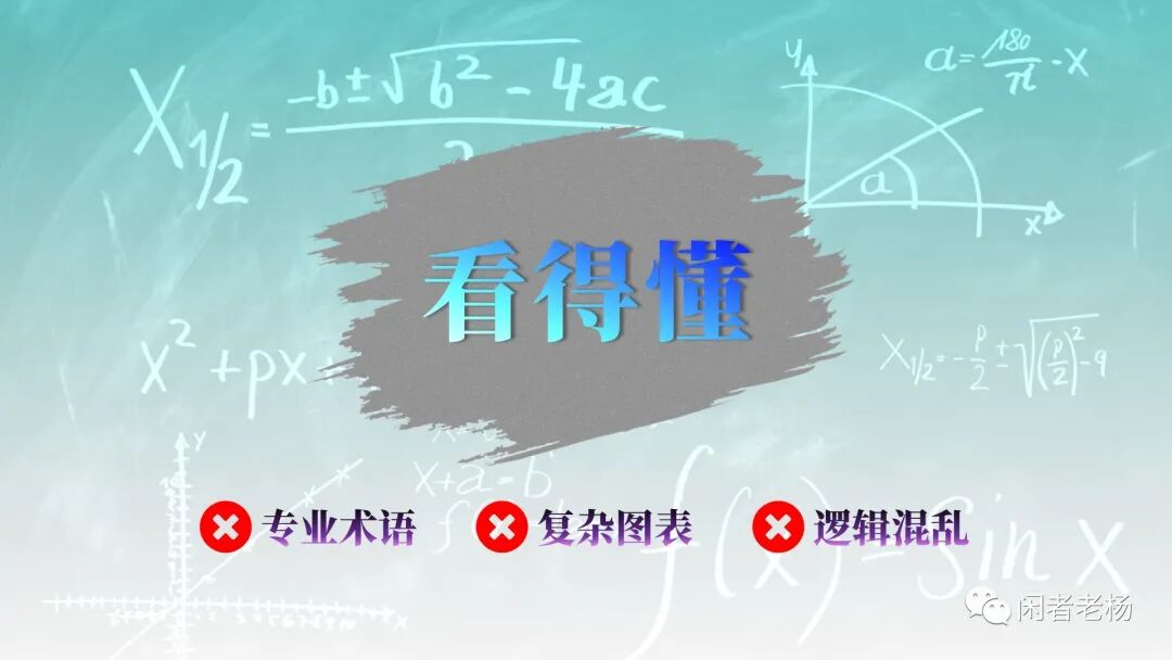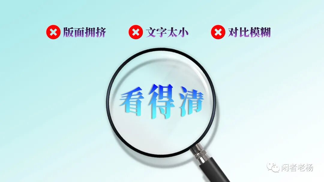 因为,无论什么 PPT 都是给人看的。所以,必须要把看的人是谁搞清楚。这里不会对受众做垂直分类,只说通常意义上的“人”,也就是泛指正常人。就是这么简单一个问题,可能你会觉得我无病呻吟。然而,根据我的观察,真正思考过这个问题并且基本做到的人,可以说凤毛麟角。换言之,绝大多数人做的所谓 PPT 都不算是给人看的,多半都是在挑战人类肉体的极限,比如眼睛、大脑、心脏……反正,正常人基本上看不了。所以,关于这部分,其实就两个字:体验。受众的体验就是我们要解决的问题。我将这种体验由浅到深、由易到难分为四个层次,分别是:看得清、看得懂、看得上、看得爽。大概也就隔着一尺的距离看得清。不信你去打开你的 PPT 看看,隔着三尺是不是就有种在被穿白大褂的大妈医生测视力的感觉了?这不是挑战肉体极限?版面拥挤。顾名思义,就是满篇都是内容,那么势必有些地方能看清,有些地方就看不清。文字太小。一个是字体、一个是大小,有些字体本身太细看不清,有些是文字设置得太小看不清。对比模糊。这个很多人都没有意识到。主要是文字和背景的对比,我们知道在白纸黑字很清晰,黑纸白字也很清晰。但是如果文字和背景都是深色或者都是浅色,就比较考验视力了。简言之,文字和背景的颜色尽量要一深一浅,形成较明显的对比,便于人类观看。至于如何配色,不在本文的讨论范围。很多人,为了装哔,故意在自己的 PPT 里加入一些不明觉厉的东西,比如一些专业术语、复杂的图表等等。他们自以为这看起来会显得很高级,这就是典型的自嗨。同时,逻辑上的混乱也会给人造成巨大的困扰,尤其是在套模板的时候,因为死搬硬套,看着好像挺好看,但其实逻辑和内容完全不沾,结果往往是狗屁不通。反例如下:请随时提醒自己,这是给人类看的,所以务必要说人话,而且要按照人类的习惯说。如果你的 PPT 既能看清也能看懂,说明已经入门,接下来要考虑的就是如何才能让人看得上了。所谓看得上,即你的内容对他人是否有用,实在不行的话有趣也行,再不行至少得有兴趣吧。比如像我这样放个美女上去,再怎样起码养眼,不招人厌吧。比如说,我这个 PPT 解决的就是普通人对 PPT 的认知问题;产品发布会的 PPT 解决的就是观众对产品特性的认知问题;年终总结 PPT 解决的就是领导对你整年工作的认知问题,等等。事实上,绝大多数人做 PPT 都是为了帮助自己解决某个问题,而不是观众。你仔细想想是不是这样?这基本上是最高境界了,即你的作品要能引起观众的共鸣。虽然 PPT 是一种视觉呈现,但终究是通过传递信息来传递某种思想或情感的。要做到这一点实属不易,这里不做过多的讨论,把前面三点做好已经可以超过 95% 以上的人。
