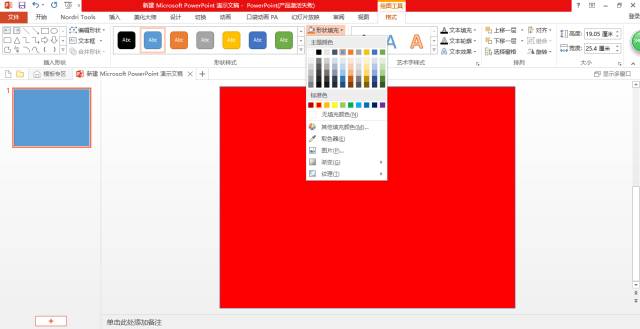 覆盖完毕后,选中画出的矩形,选择格式选项卡>形状填充及轮廓填充中都填充为大红色。