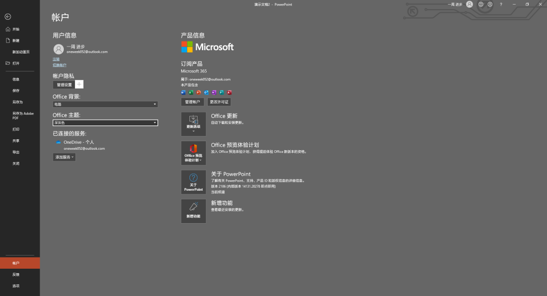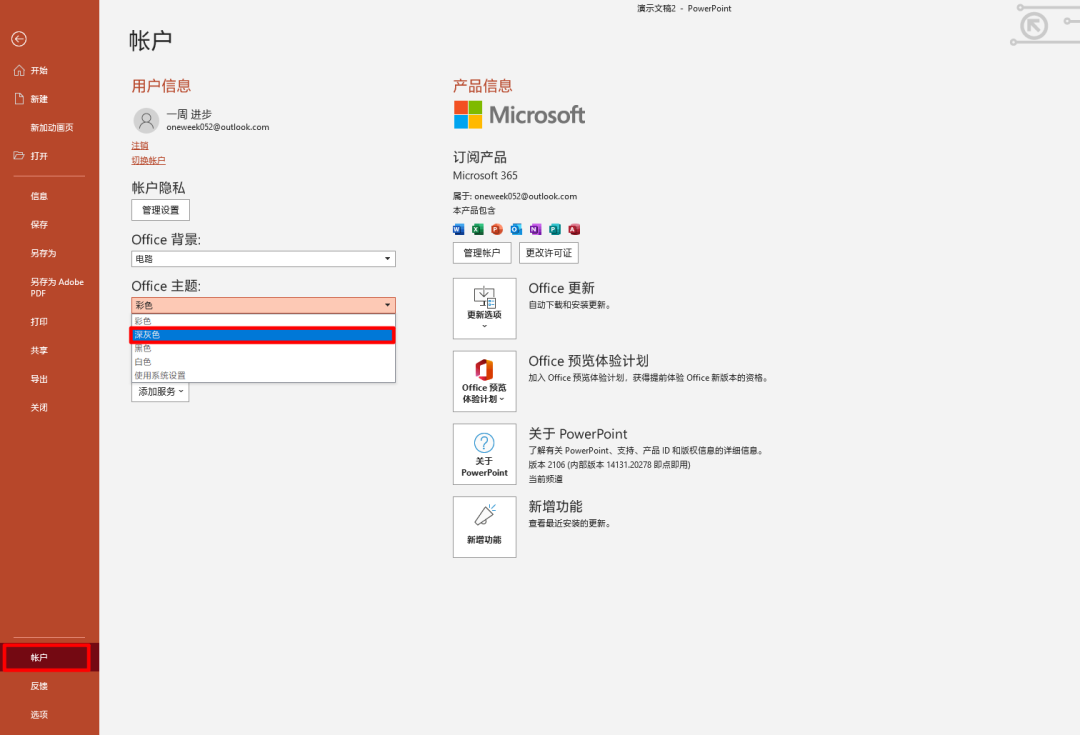 我将最常用的的窗格这样排列在桌面右侧,这是我设计PPT时早已习惯的最高效操作界面。只有这样,无论怎么点击,窗格都能稳定排列,不影响操作。不仅如此,你还可以在【文件】—【账户】中选择一个酷炫的【深灰色】主题。更换了主题颜色之后,看起来是不是很像一个专业设计软件,非常酷。