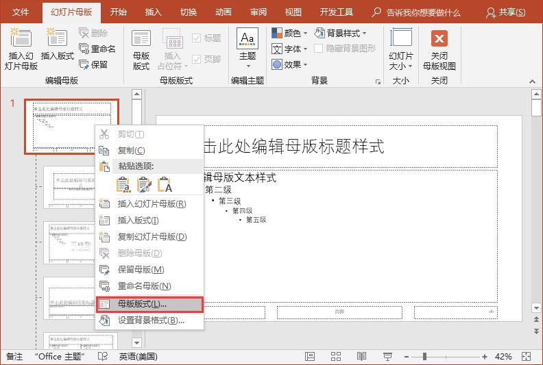 (1)首先点击【视图】-【母版视图】-【幻灯片母版】按钮,打开母版视图。在母版的第一页上,点击右键菜单中的母版版式。