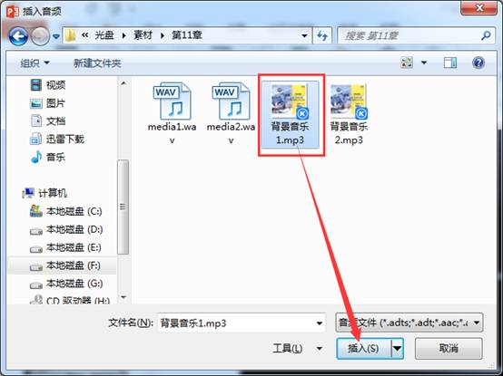 打开“插入音频”对话框,在打开的对话框中选择需要插入的背景音乐,然后确认插入即可。