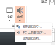 在“插入”选项卡中单击“音频”按钮,在打开的下拉列表中选择“PC上的音频”选项。