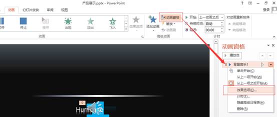 在第1张幻灯片上插入背景音乐之后,单击“动画”选项卡中的“动画窗格”按钮,在打开的“动画窗格”中找到背景音乐的动画效果,在其上单击鼠标右键,在弹出的快捷菜单中选择“效果选项”命令。