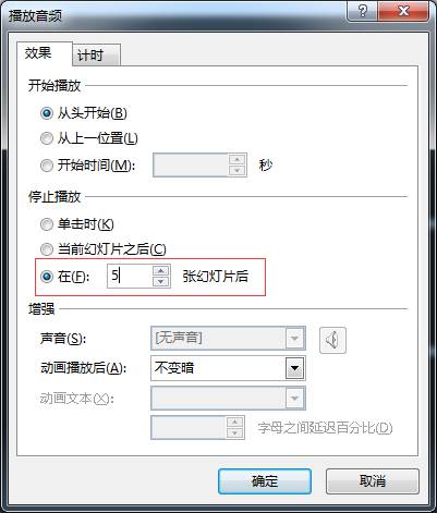 打开“播放音乐”对话框,在“停止播放”栏设置在5张幻灯片之后停止,确认设置后,在第6张幻灯片再插入其他背景音乐,再用相同的方法设置需要持续到的幻灯片即可。