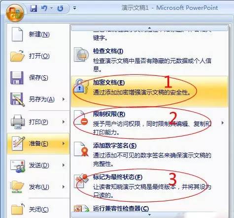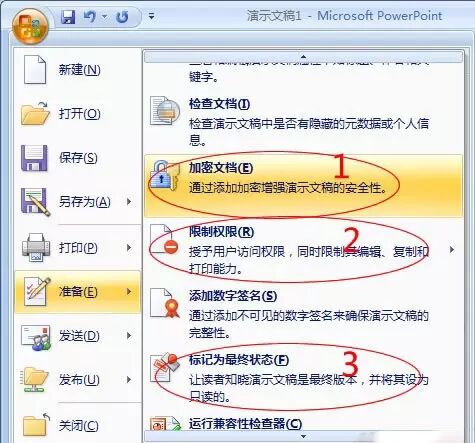 单击“Office按钮”选择“准备”,此时,有三种不同方式来设定文档安全问题;(如下图中红色区域的1、2、3)