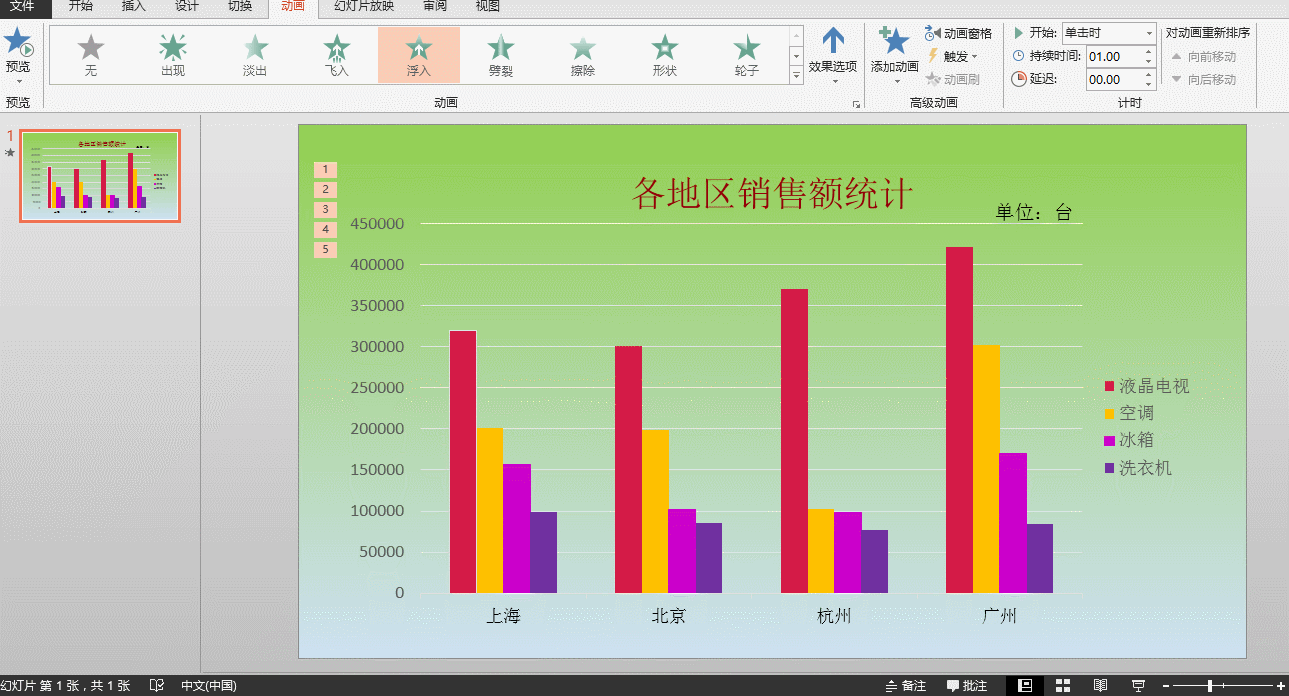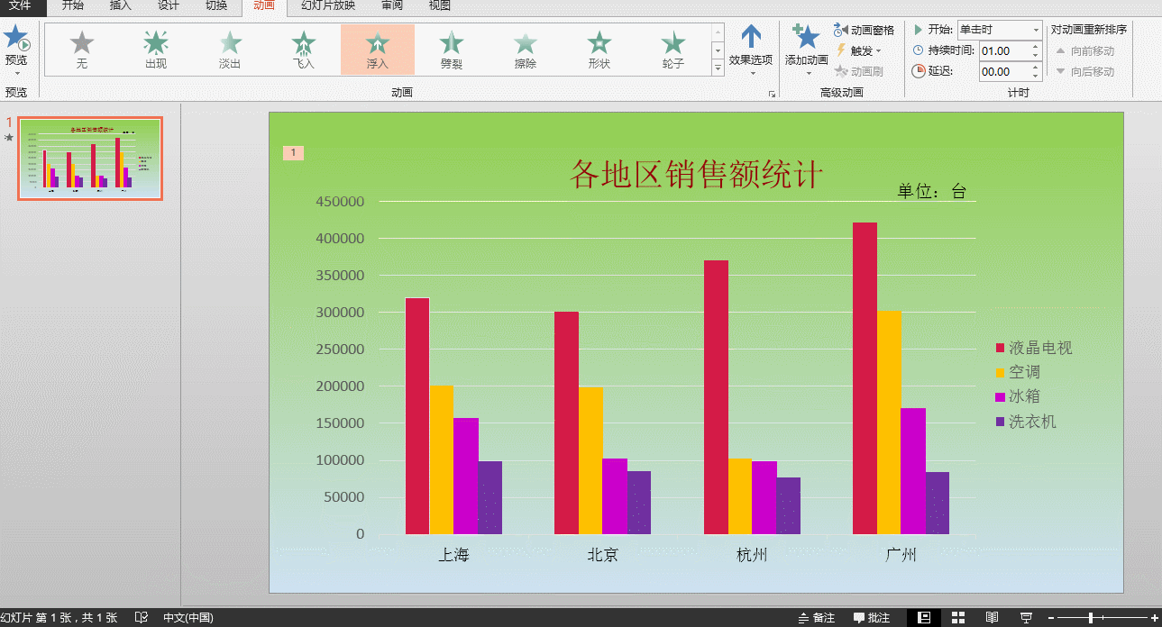 一、选中图表,单击动画选项卡,在动画选项卡下面的动画组中选择一种合适的动画效果,我们在这里选择浮入,选择完之后图表会自动的进行一次预览效果。