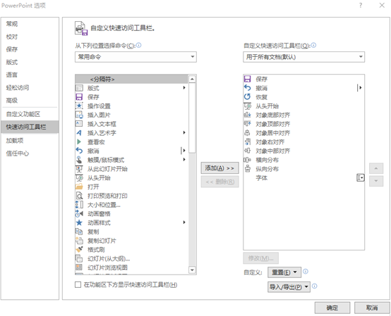 添加方式,选项——快速访问工具栏,还可以在工具上右击——添加到访问工具栏