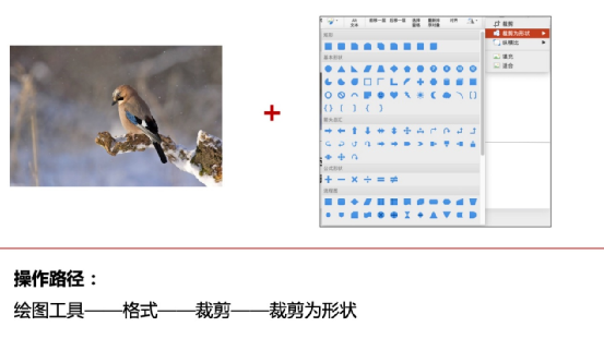形状裁剪是PPT图片比较常见的处理方法之一,比如我们将图片裁剪为有趣的形状。操作步骤:选中图片,点击“绘图工具”——“格式”——“裁剪”——“裁剪为形状”,如下图所示: