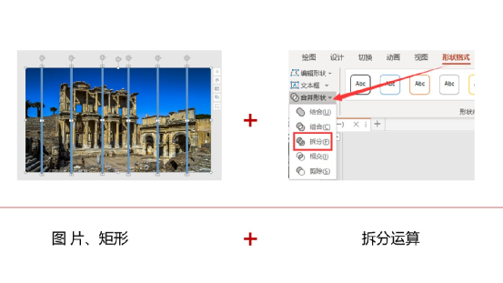 接下来,我们先选择图片,按住Shift键的同时,再挨个选中矩形色块,最后进行合并形状中的拆分运算就可以了。