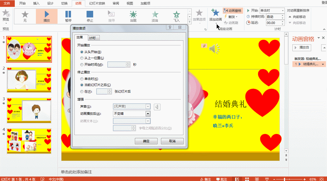 一、选中音频音频按钮---动画选项卡---高级动画组---动画窗格---点击下拉按钮---效果选项。