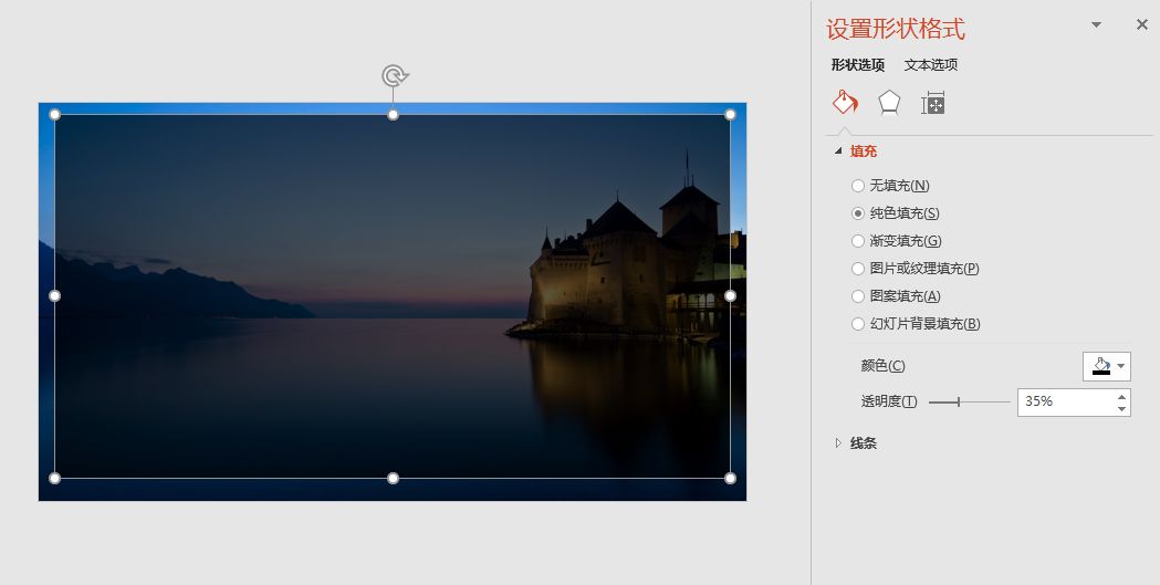 方法为:插入一个与图片等大的矩形,然后填充黑色,打开“设置形状格式”任务窗格,适当调整透明度。