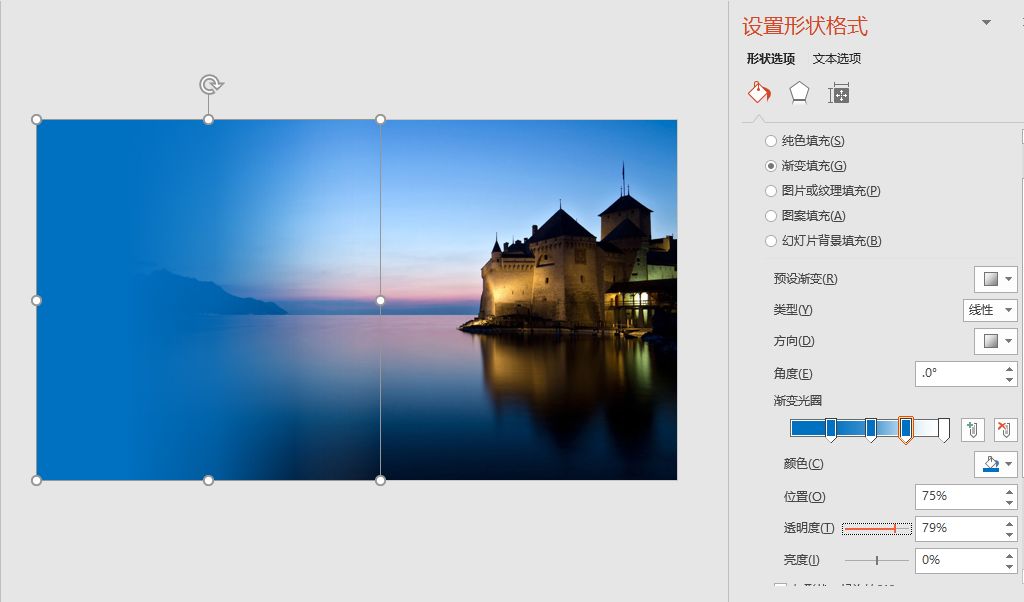 方法为:插入一个与图片等大的矩形,打开“设置形状格式”任务窗格,选中“渐变填充”,设置渐变光圈颜色和透明度如下图所示。