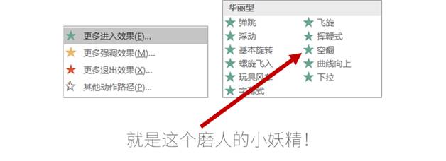 这个一个字一个字飘下来的动画叫做「空翻」,藏在【更多进入效果】的「华丽型」里面。