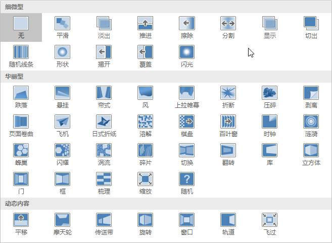 仔细观察,PPT 中一共有三种动画分类,分别是「细微型」「华丽型」「动态内容」。