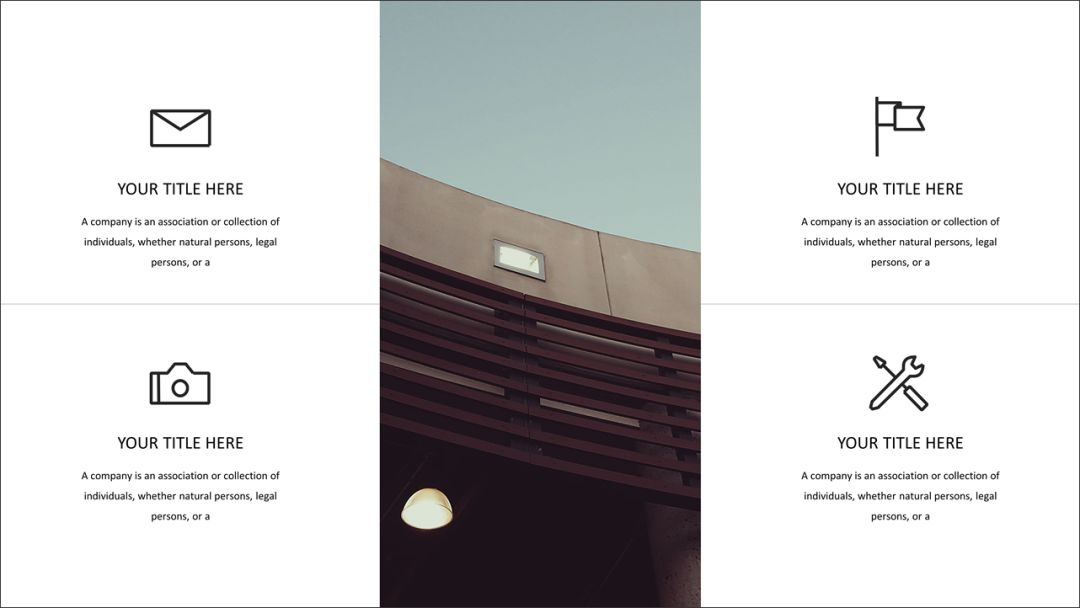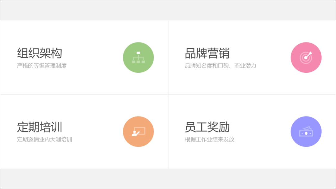 大家注意看上面这张幻灯片的图标部分,有纯白的,也有半透明的,这就是局部上色;这么做不仅可以增加设计感,还可以让重点更突出。