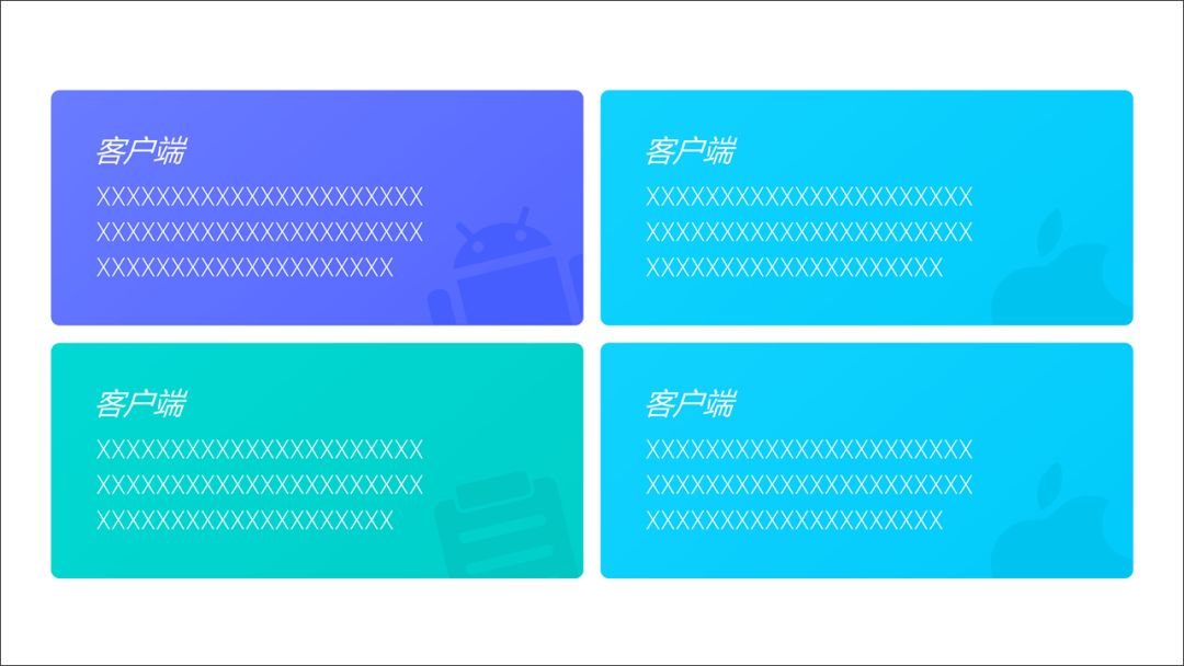 比如上面这张幻灯片的右侧,图标下面都是色块,这也是我们最常见的,制作比较简单,如果色块的形状选择和颜色选择比较好,做出来还是不错的。
