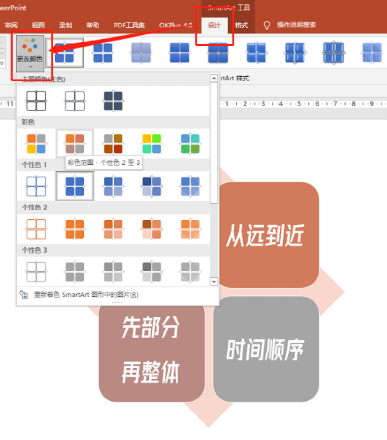 在【设计】——【更改颜色】中,提供了多种配色供选择。