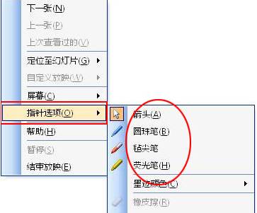 在播放PPT时,为了让效果更直观,有时我们需要现场在幻灯片上做些标记,这时,我们只需在打开的演示文稿中单击鼠标右键,选择“指针选项”,再按照自己的习惯选择相关的工具即可。
