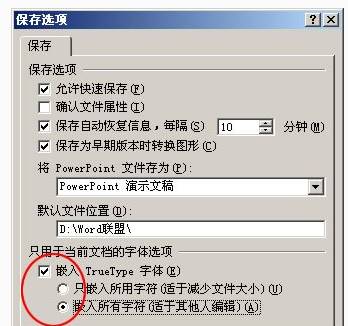 (2)在弹出的对话框中选中“嵌入truetype字体”,再根据需要选择“只嵌入所用字符”或“嵌入所有字符”项,最后点击“确定”按钮保存文件即可。