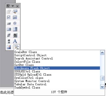 (1)点击"视图”-“工具栏”-“控件工具箱”里点击 “其他控件”,在弹出的下拉列表里选择“shockwave flash object”;