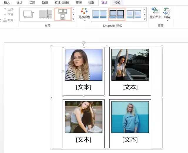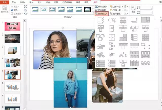 如果你需要一次性添加很多张图片,不要紧张,你可以选择【插入】所有的图片之后,全选这些图片,然后点击图片的【格式】-【图片版式】,然后选择自己喜欢的版式套用就Ok啦~