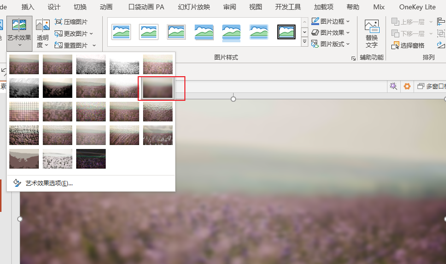 3.我们选择这张图片素材,在【图片格式】-【艺术效果】里,选择虚化