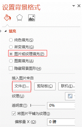 2.在“设置背景格式”中,选择“图片或纹理填充”。 3.然后点击“文件”按钮。 4.然后插入一张准备好的图片。 5.根据需要设置透明度,是否平铺以及设置相关参数。 6.当前设置仅针对当前的PPT生效,如果需要给全部的幻灯片都设置相同的背景,点击最底下的“全部应用”即可。 这样一来,就可以将图片设置为PPT的背景了,并且可以应用于全部的幻灯片,设置起来比较快捷方便。