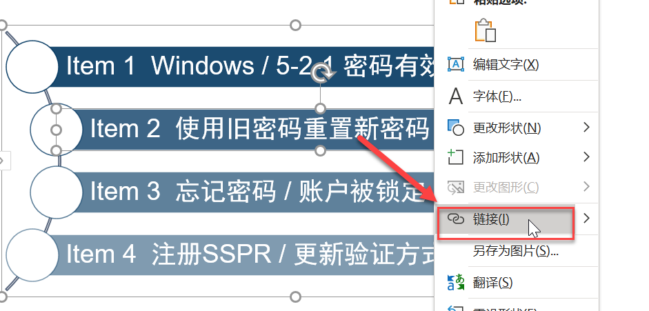 1. 打开你已经设置好的PPT,选中并右键点击需要做超链接的内容,在弹出的菜单中,点击链接。