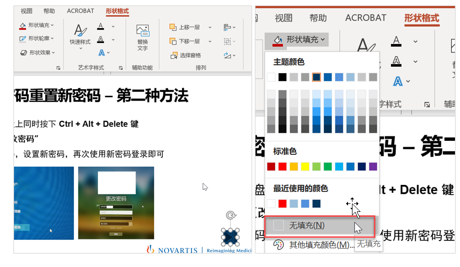 2. 插入动作按钮后,如果你不想让它显示在页面上,可以点击形状格式,颜色设置为无填充,即可隐藏此按钮图标。