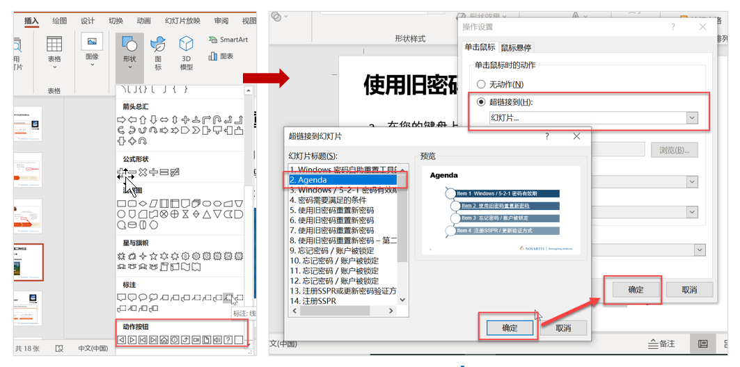 1. 找到需要设置返回功能的页面,插入动作按钮,动作按钮的图标添加到页面中,页面上弹出操作设置的窗口,选择超链接到幻灯片并选定目标界面,点击确定。页面自动消失,动作按钮设置完成。