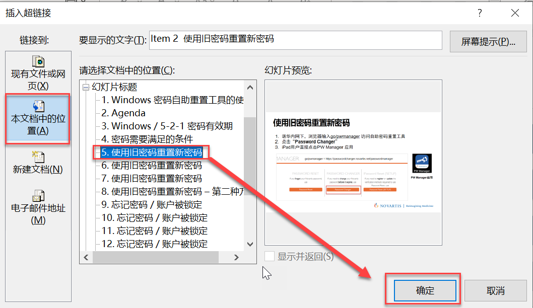 2. 在弹出的窗口中,点击本文档中的位置,找到并选中需要链接的PPT页面,然后点击确定。