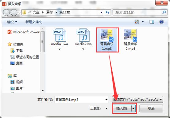 打开“插入音频”对话框,在其中找到并选择某个背景音乐文件,然后单击“插入”按钮,即可将选择的背景音乐插入到第2张幻灯片中。