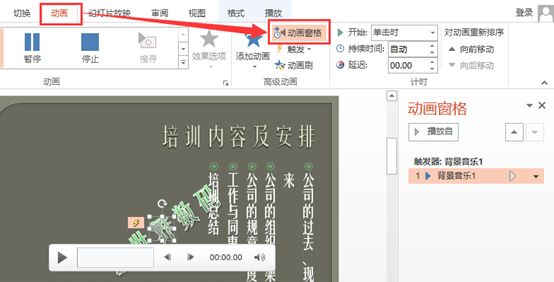 保持音乐图标的选中状态,在“动画”选项卡中单击“动画窗格”按钮,打开“动画窗格”。