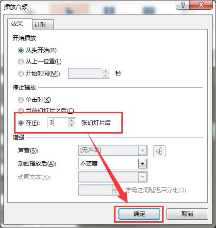 打开“播放音频”对话框,在“停止播放”栏选中“在XX张幻灯片后”单选项,并在文本框中输入“3”,表示背景音乐会在第2张幻灯片开始播放并持续3张幻灯片,然后单击“确定”按钮,确认设置。