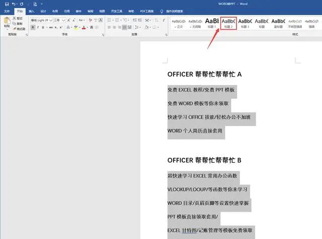 メ我们先选中两段的首行点击【标题1】,将其设置为一级标题内容。メ