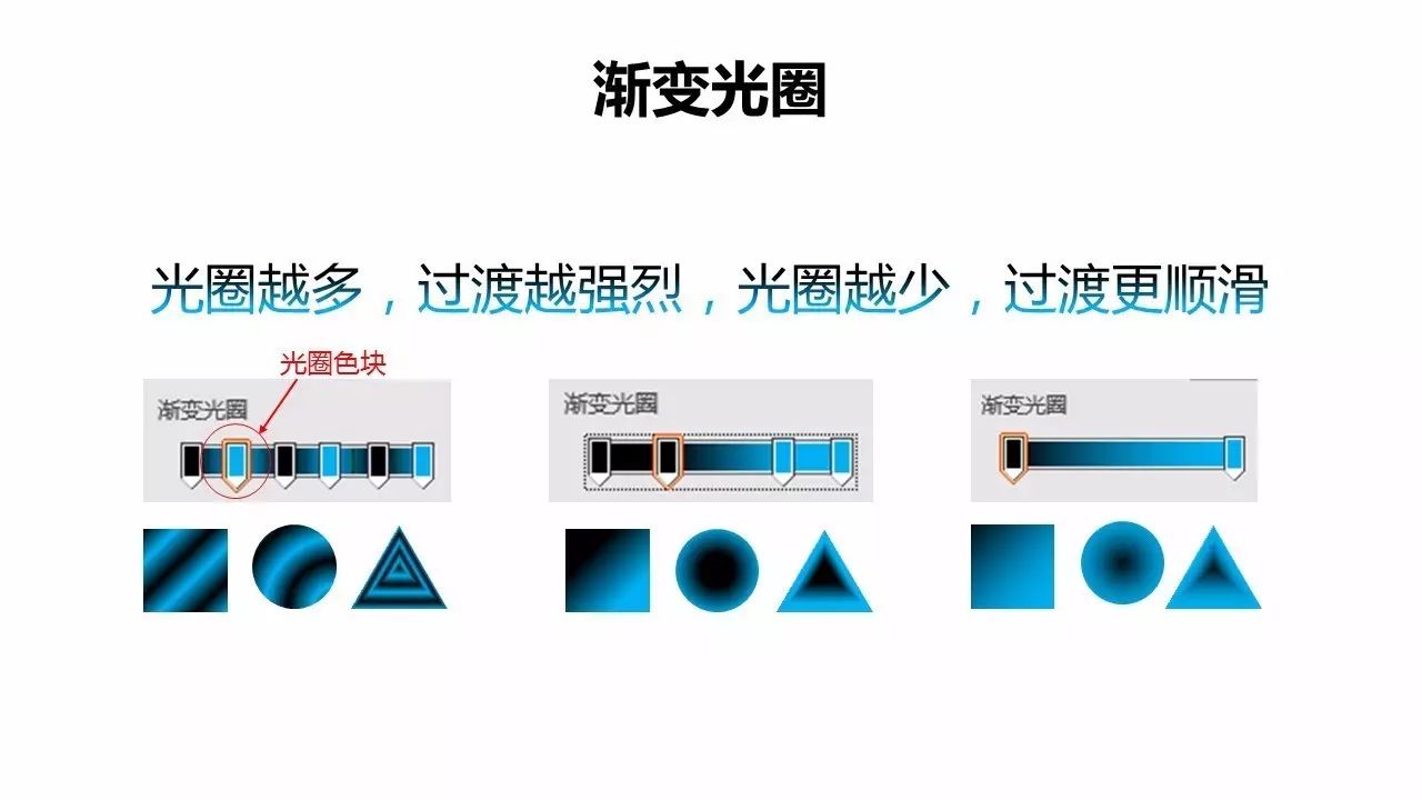 使用渐变,我们一定要认识【渐变光圈】,它是我们设置渐变色的基础,当只有一种色的时候是纯色,当出现≥2种色的时候,就形成了渐变。光圈色块越多(即颜色越多),渐变过度越强烈,光圈越小(即颜色越少),渐变过渡越顺滑。