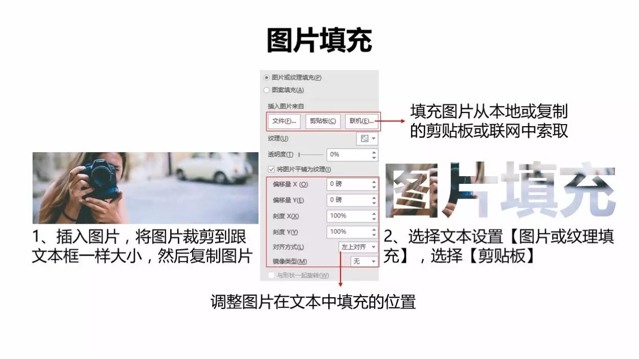 有三种方式,一是直接选择从本地文件中获取图片,一种是从联网中找图片,这两种方法,一旦图片大小和文本框大小不一致,填充出来的的图片就会被压缩,当然可以设置【将图片平铺为纹理】,再进行位置调整。另一种方法,则是先插入一个图片,裁剪图片保留位置与文本框大小一致,然后复制图片(相当于把它存入剪贴板中),然后填充图片时选择剪贴板即可。
