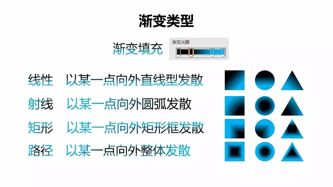接下来需要了解渐变的类型,基本型一共四类:线性、射线、矩形和路径,其中每个分类还以设置不同方向的渐变形式,只有线性还多一项选择是不同角度渐变。看下图,来先了解下不同渐变类型的原理,直观感受其效果。