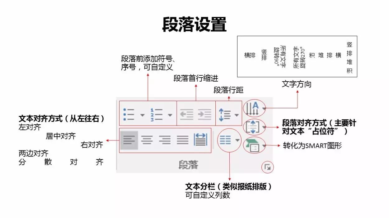 ④文字方向:横排(即文本框原版式)、竖排(即垂直文本框原版式)、所有文字选择90°或270°,以及堆积(★可以自己动手看看每个效果的呈现,学习设计,不管是PPT也好,还是PS、AI等等,最重要的一定是动手实践,教程说的再细再好,也不如自己亲自动手一把)